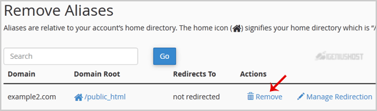 3. Under Remove Aliases, locate the parked domain name and click on the Remove link.