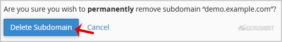 5. You will receive a warning that you are removing a subdomain.example.com. You will need to click on the Delete Subdomain button to remove your subdomain permanently.