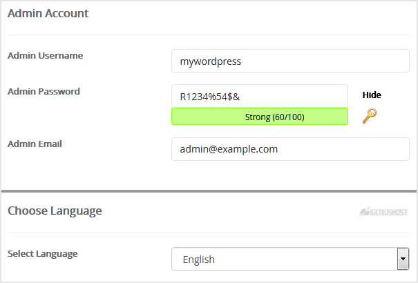 - Admin Username: Your new WordPress username (for security reason do not use the Administrator or the Admin username.