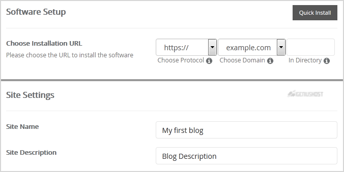 - Choose Installation URL: Choose the appropriate protocol/domain. Inside the "In Directory" field, should you want to install this in a directory, i.e., example.com/directory, enter the directory name. Otherwise, leave it blank to install in your main domain, i.e., example.com