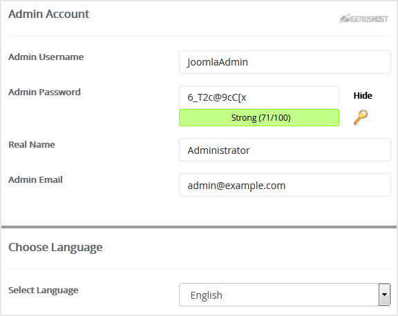 • Admin Username: Your new Joomla username (for security reason do not use the Administrator or the Admin username.)