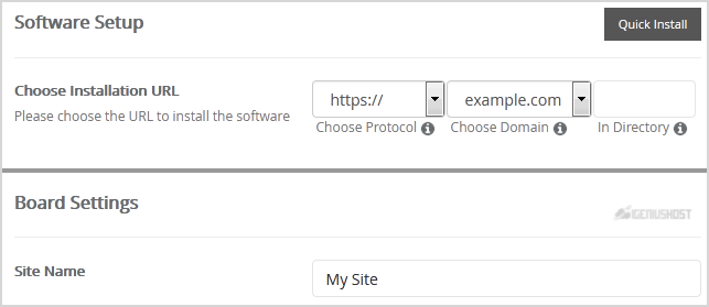 - Choose Installation URL: Choose the appropriate protocol/domain. Inside the "In Directory" field, should you want to install this in a directory, i.e., example.com/directory, enter the directory name. Otherwise, leave it blank to install in your main domain, i.e., example.com.