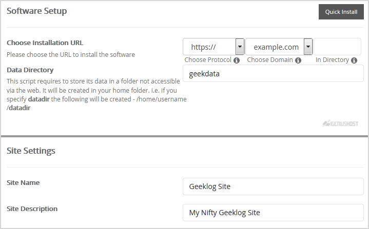 Note: Copy the admin username and password on a notepad because you will need these login details to access the admin area of your Geeklog Website.