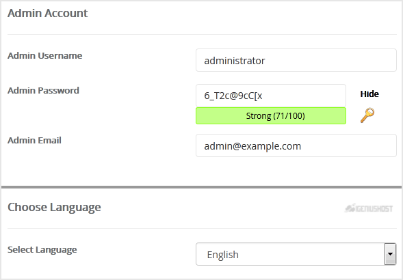• Admin Username: Your new Microweber username (for security reason do not use the Administrator or the Admin username.)