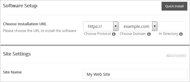 - Choose Installation URL: Choose the appropriate protocol/domain. Inside the "In Directory" field, should you want to install this in a directory, i.e., example.com/directory, enter the directory name. Otherwise, leave it blank to install in your main domain, i.e., example.com